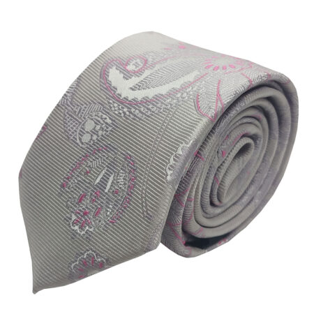 Gravata Semi Slim Cinza Bordados Rosa