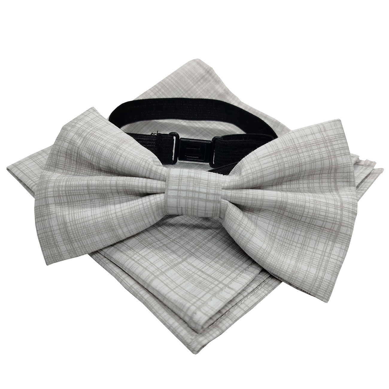 Kit gravata borboleta + lenço de bolso cinza gelo riscado