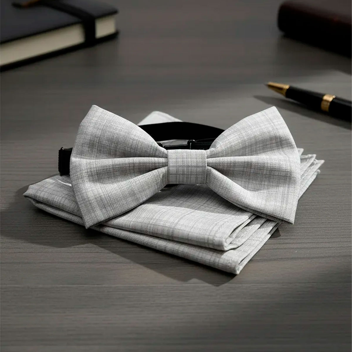 Kit Gravata Borboleta + Lenço De Bolso Cinza Riscado