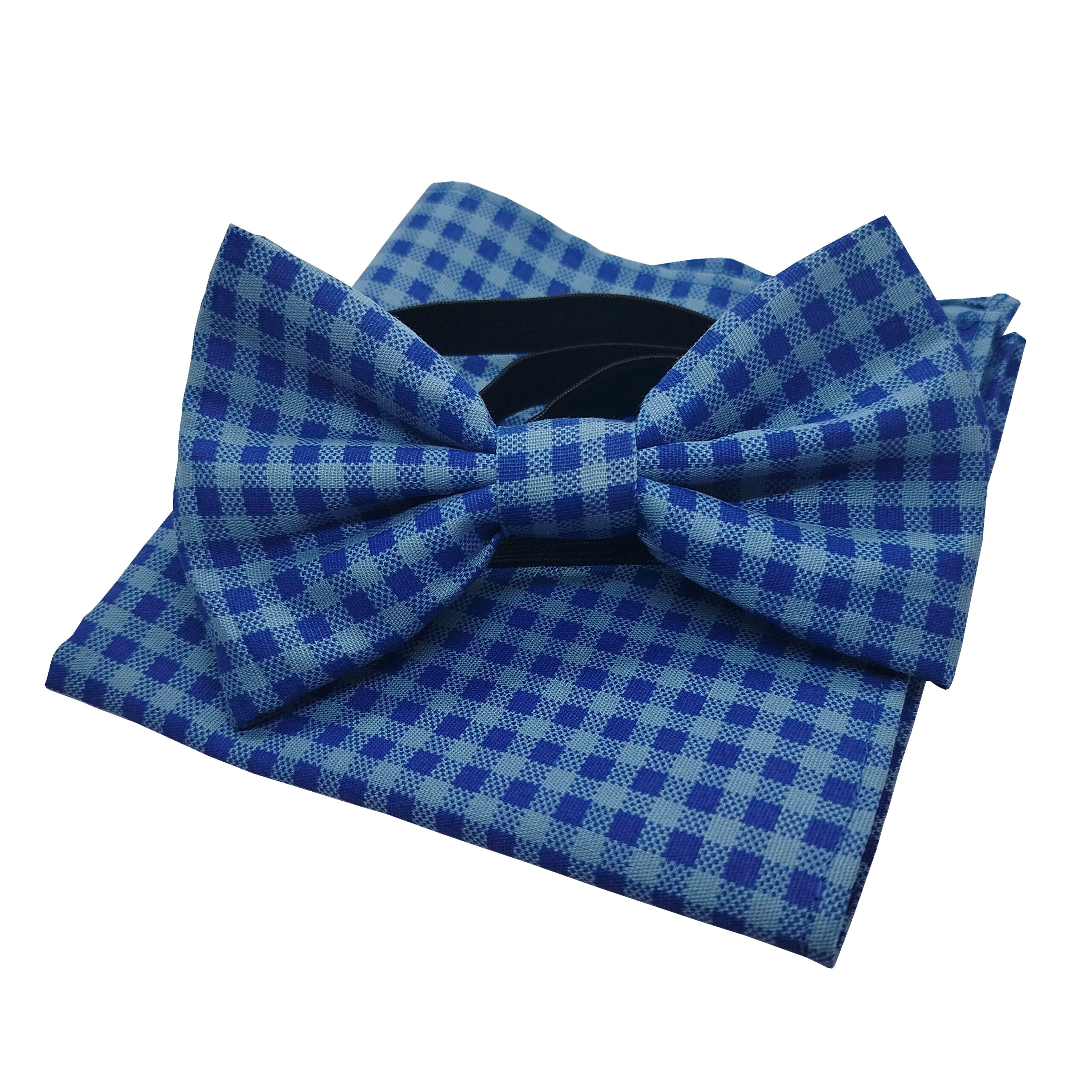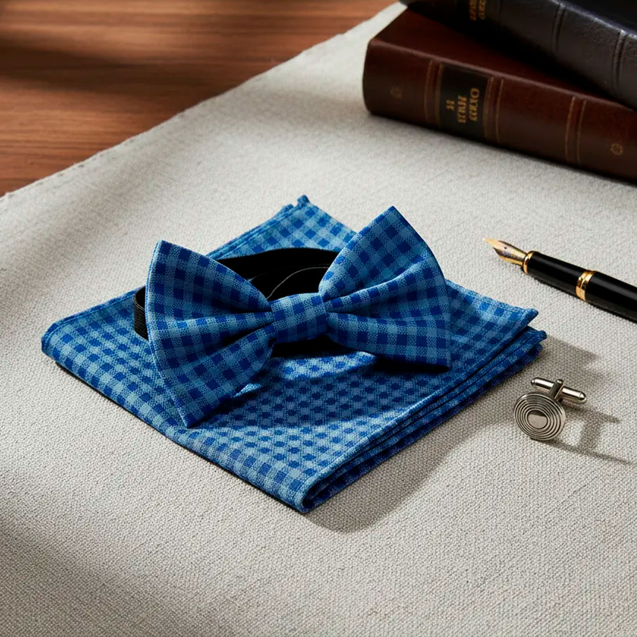 Kit Gravata Borboleta + Lenço de Bolso Xadrez Azul Algodão