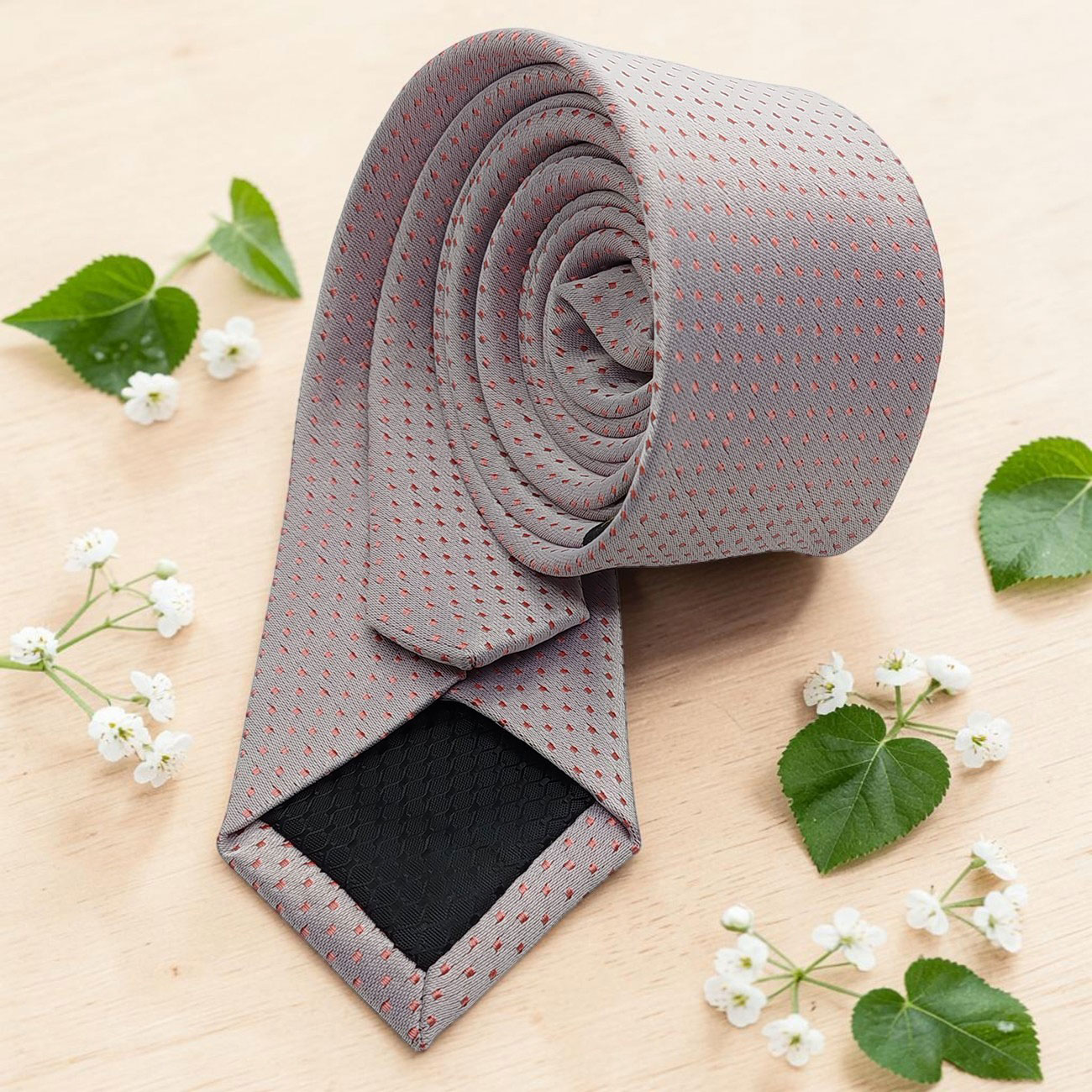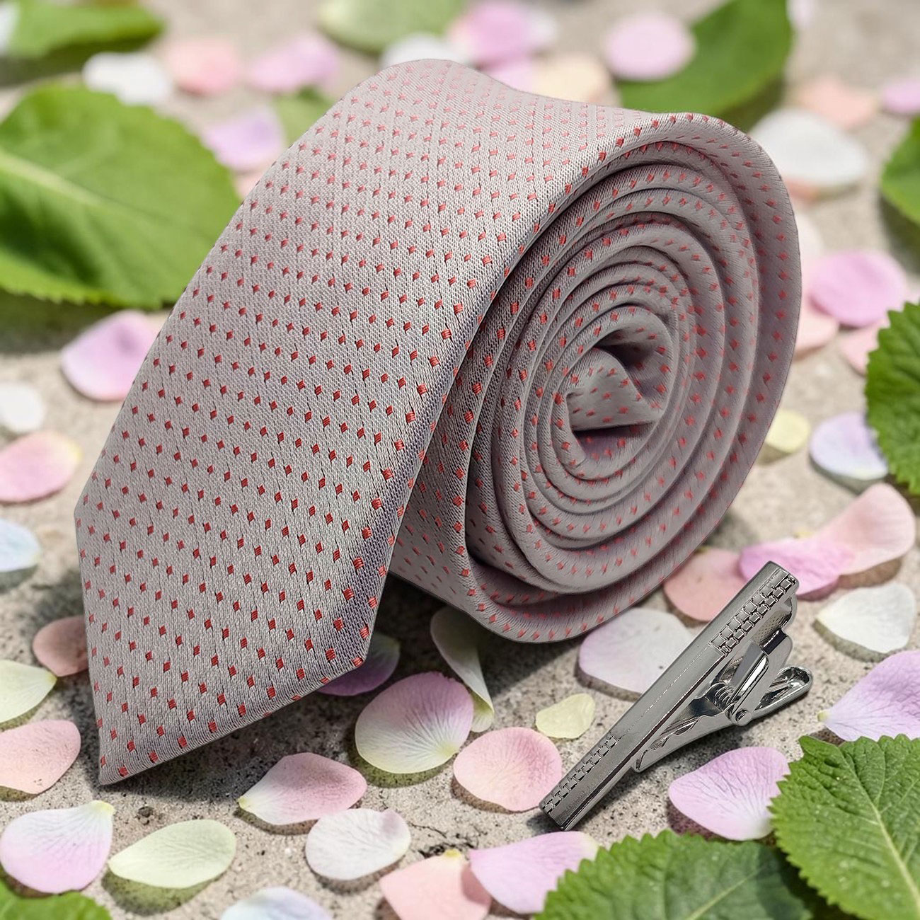 Gravata com a cor predominante em tons clarinhos com bordados pontilhados em salmão, com fino acabamento.
