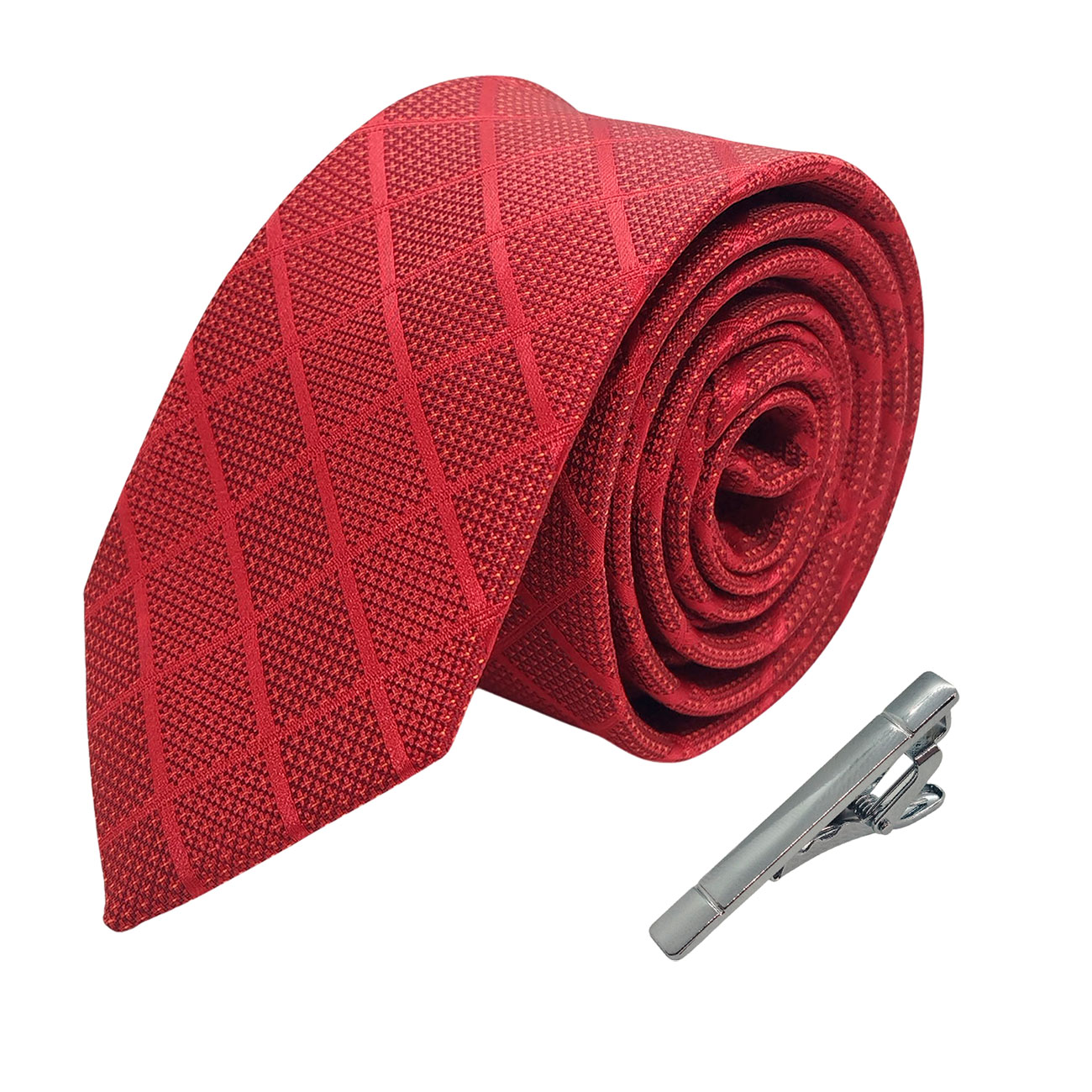 Kit Gravata Slim Vermelha Quadriculada + Prendedor Slim
