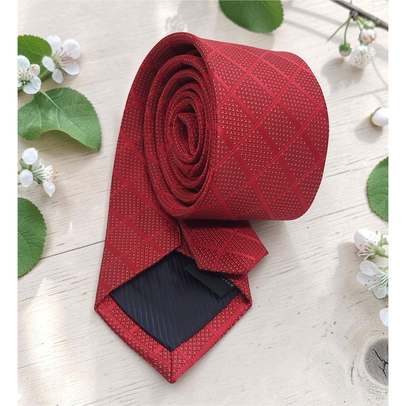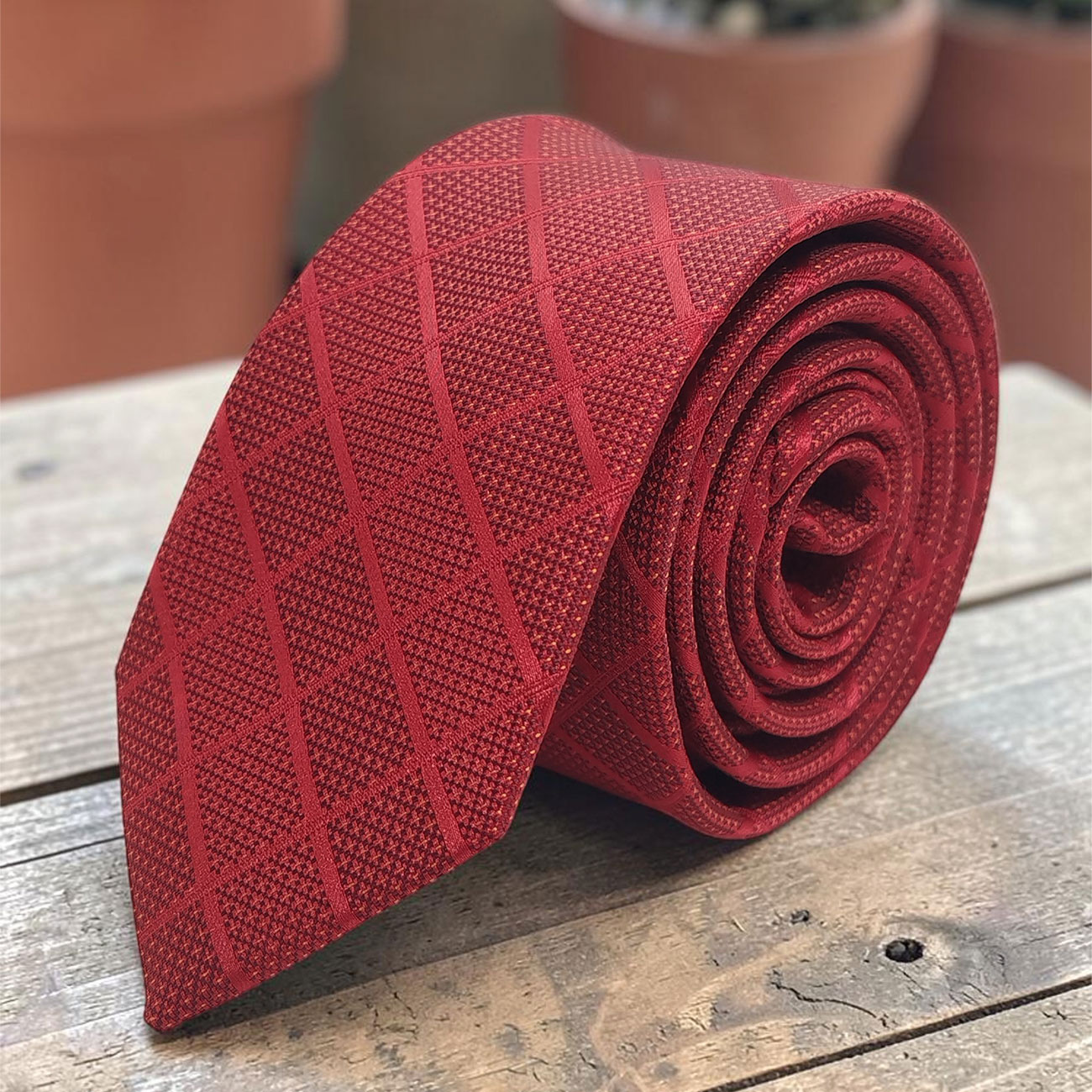 Gravatas slim tecido trabalhado quadriculado especial, na cor vermelha, para ocasiões formais e trajes de negócios